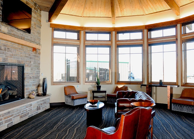 In a high mountain Colorado setting materials of choice included hammered copper with leaf imprints, fault line patterned carpet, and wool textiles mixed with saddle leather. This FBO has a feeling of lodge mixed with modern technology.