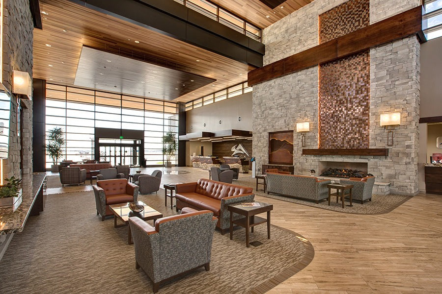 Whether you come to the Great Salt Lake area for fresh powder skiing, fly fishing, hiking or business you are greeted by the finest lodge design in town. Tall stone fireplaces dressed up with copper reflecting tiles and hand forged light fixtures add a sense of elegance to this mountain style setting. Handsome furnishings were custom selected to flow with the rich earth tones and still be highly durable for years to come. Elegance meets lodge in this FBO lobby.